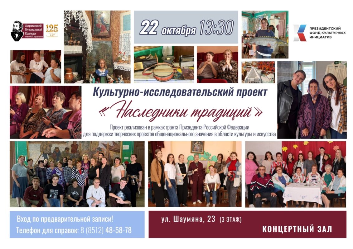 На базе Астраханского музыкального колледжа им. М.П. Мусоргского стартовал культурно-исследовательский проект «Наследники традиций». Проект реализуется в рамках гранта Президента Российской Федерации для поддержки творческих проектов общенационального значения в области культуры и искусства.